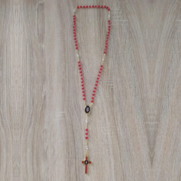Chapelet avec 5 douzaines de grains rouges séparées par un grain blanc, grains en forme de cœur, maillons renforcés. Livré avec un feuillet dépliant comprenant le chapelet du Précieux Sang, les litanies et la prière de consécration révélés par Jésus.